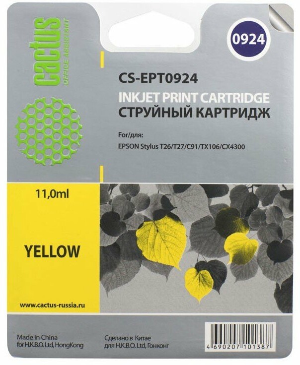 Картридж Cactus T0924 (CS-EPT0924) струйный желтый (6.6мл) для Epson Stylus C91/CX4300/T26/T27/TX106/TX109/TX117/TX119