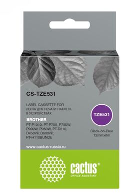 Картридж ленточный Cactus CS-TZE531: черный текст на синем фоне, ширина ленты 12 мм, длина 8 м. Ламинированная лента для печати наклеек подходит для маркировки любых предметов, от кабеля, трубопровода и оборудования, до папок и полок. Наклейки обладают хорошей устойчивостью к экстремальным температурам, трению, воздействию химикатов и солнечного света. Можно использовать на открытом воздухе.